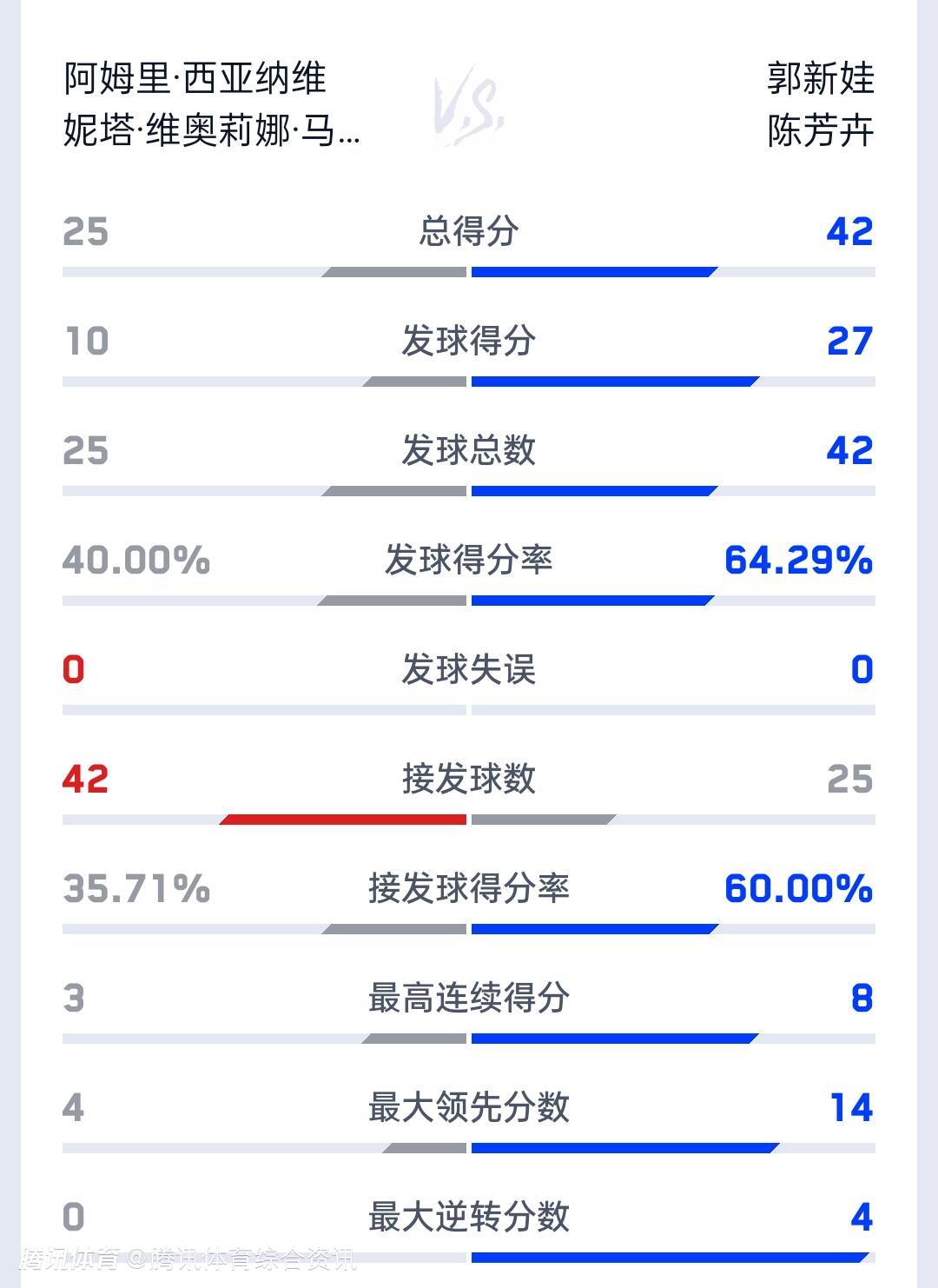 双方技术统计如下(郭新娃/陈芳卉在后):总得分25-42、发球得分10-27、发球得分率40.00%-64.29%。