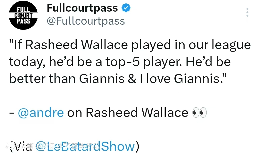 2025-09-18 20:10北京时间9月18日,前NBA球员伊戈达拉谈到了拉希德-华莱士,并表示如果华莱士在当今的NBA打球,会是联盟前5的球员,比字母哥还要强。