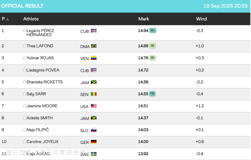 2025-09-18 21:50北京时间9月18日,在2025年东京田径世锦赛女子三级跳远决赛中,南京室内世锦赛冠军、古巴选手莱亚尼斯-佩雷斯状态火热,两次跳出14米94,刷新本赛季世界最好成绩,首夺室外世锦赛金牌。