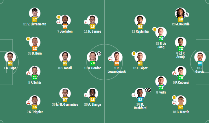 纽卡斯尔(4-3-3):波普;特里皮尔(76'博特曼),舍尔(63'佳夫),丹-伯恩,利夫拉门托;吉马良斯,托纳利,乔林顿(62'威洛克);伊兰加(63'雅各布-墨菲),戈登,巴恩斯(62'沃尔特马德)