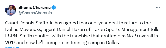 2025-09-19 07:00北京时间9月19日,据名记Shams报道,后卫小丹尼斯-史密斯已同意与达拉斯独行侠队签下一份为期一年的合约,重返球队。