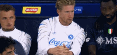 第89分钟,镜头给到场边的德布劳内。