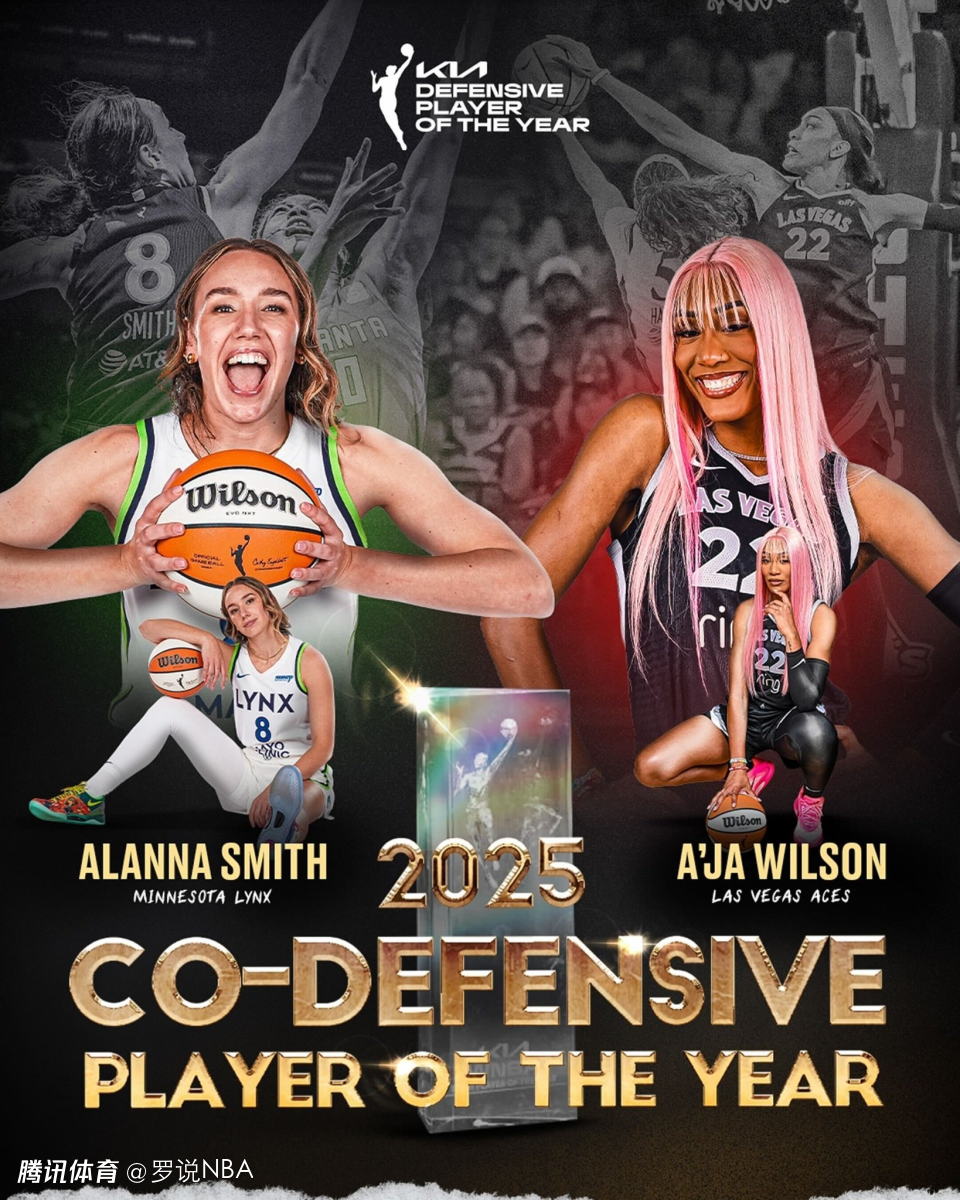 阿贾-威尔逊是热火球星阿德巴约的女友,在WNBA今日揭晓的年度奖项中,她和阿兰娜-史密斯共享了年度最佳防守球员的奖项,这也是WNBA历史上首次有两名球员共享DPOY。值得一提的是这是阿贾-威尔逊第三次当选年度最佳防守球员。
