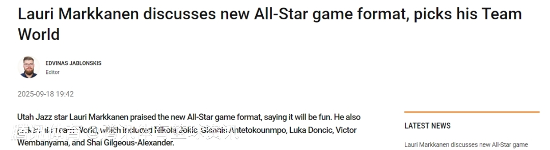 2025-09-19 09:50北京时间9月19日,爵士队球员马尔卡宁接受媒体采访,谈到了全明星赛制改制的话题。据ESPN报道,2026年NBA全明星赛的赛制很可能采用循环赛制,由三支各8人的球队组成——两支美国队和一支世界队。