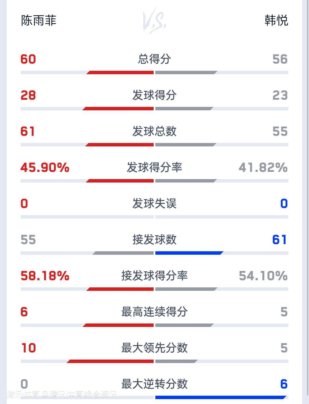 双方技术统计如下(韩悦在后):总得分60-56、发球得分28-23、发球得分率45.90%-41.82%。