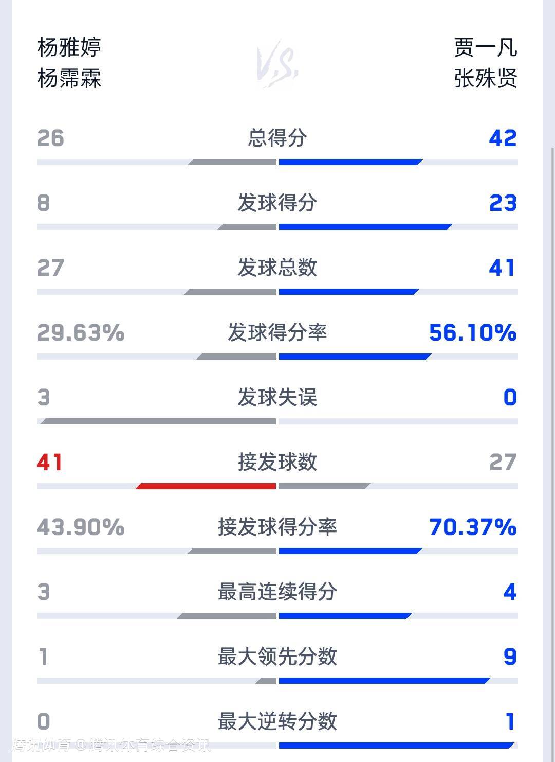 双方技术统计如下(贾一凡/张殊贤在后):总得分26-42、发球得分8-23、发球得分率29.63%-56.10%。