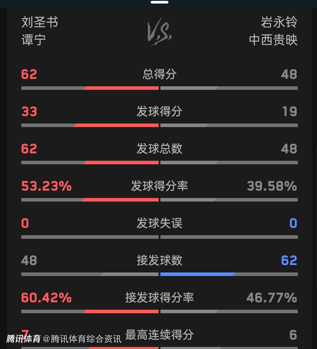 双方技术统计如下(刘圣书/谭宁在前):总得分62-48、发球得分33-19、发球得分率53.23%-39.58%。