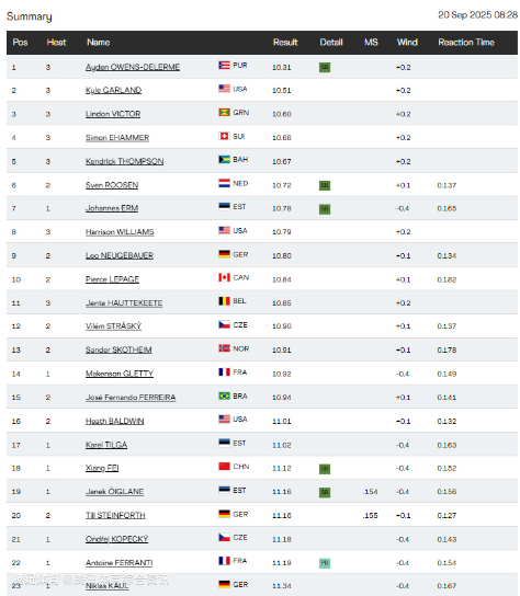 2025-09-20 09:10北京时间9月20日,2025年东京田径世锦赛男子十项全能大战正式开始。在首个项目100米比赛中,中国选手费翔完成个人世锦赛首秀,以11秒12的赛季最佳成绩完赛。