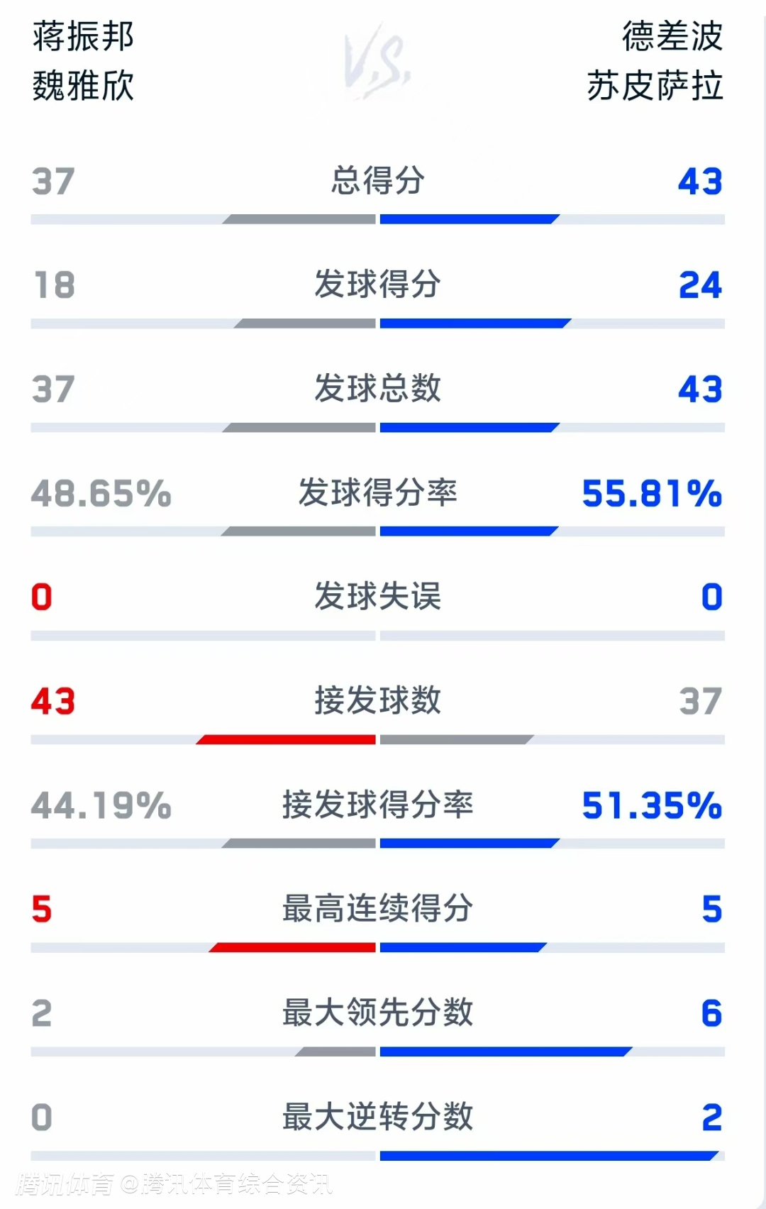 双方技术统计如下(蒋振邦/魏雅欣在前):总得分37-43、发球得分18-24、发球得分率48.65%-55.81%。