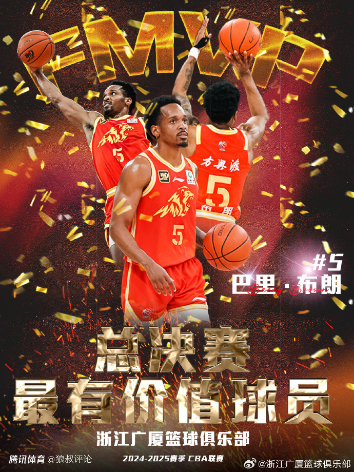 24-25赛季,布朗打出了一档小外援的比赛影响力,季后赛更是无人能挡,与胡金秋,孙铭徽组成的三大核心,在总决赛击败北京首钢拿到了队史第一座总冠军。布朗加冕总决赛最有价值球员。