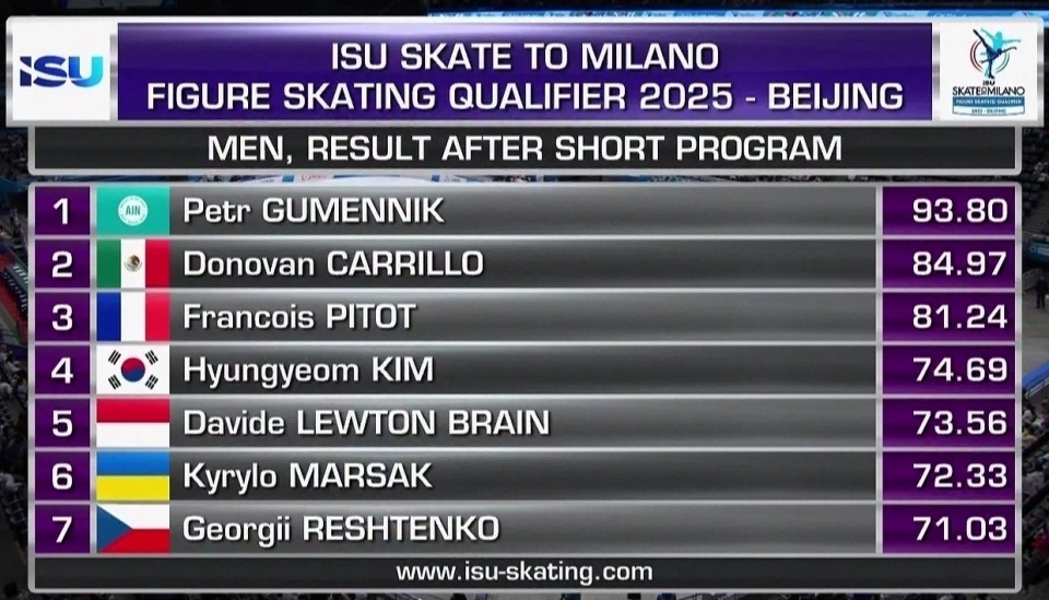 2025-09-20 14:40米兰冬奥会花样滑冰落选赛在北京首都体育馆展开了第二个比赛日的角逐:在刚刚结束的男单短节目比拼里,来自俄罗斯的中立运动员古门尼克表现突出,以93.80排在第一。