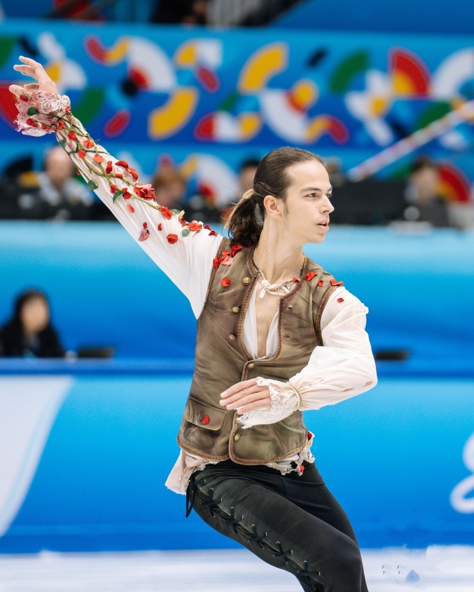 阿克塞尔三周各个细节交代清晰,蹲踞旋转采用了小跳和旋子滑出,接续步阶段通过将袖子拉长的设计,很好的点明了音乐主题。技术54.84/节目内容38.986,合计93.80...这个成绩一直保持到短节目比赛结束。