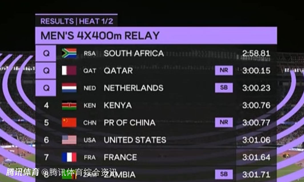 2025-09-20 19:00北京时间9月20日,在2025年东京田径世锦赛男子4x400米接力预赛中,由梁宝棠 、张起宁、刘凯和郭龙宇组成的中国队跑出了3分00秒77的国家纪录,排名第1组第五位。三届卫冕冠军美国队排名本组第六,已经确定无缘晋级决赛。