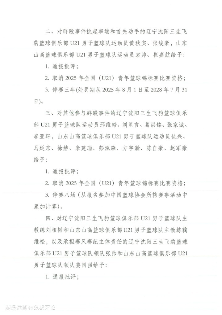 中国篮协开出重磅罚单,对该事件挑起事端和首先动手的黄秋实、张峻豪、袁帅、崔嘉航4名涉事球员给予停赛三年的处罚,对另外13名涉事球员给予 停赛八场的处罚。