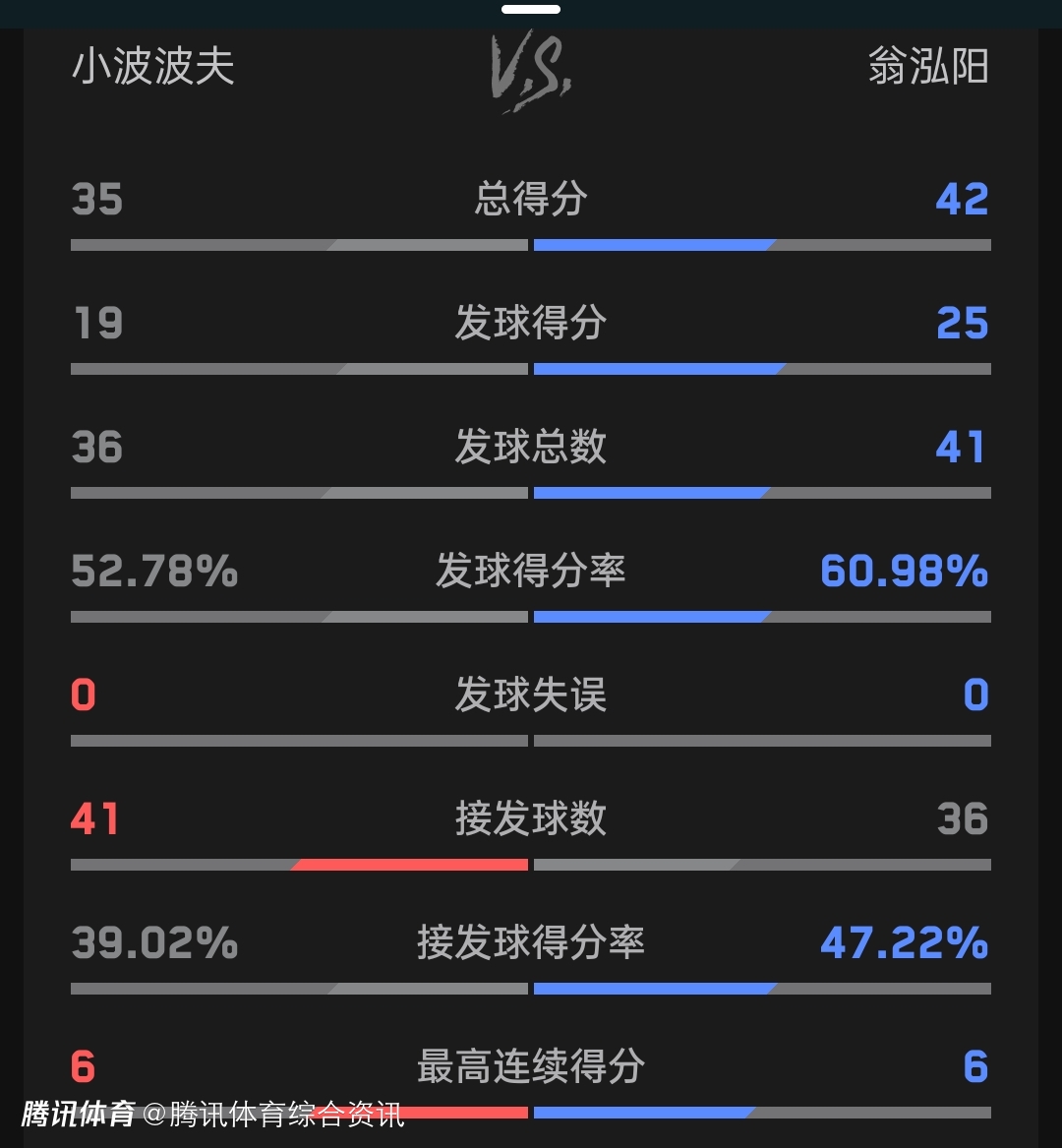 双方技术统计如下(翁泓阳在后):总得分35-42、发球得分19-25、发球得分率52.78%-60.98%。