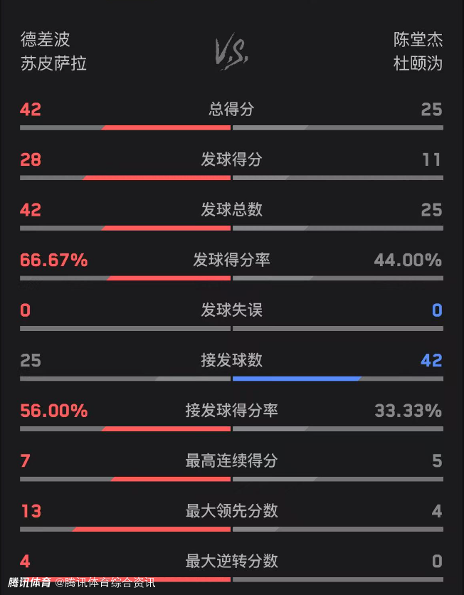 双方技术统计如下(德差波/苏皮萨拉在前):总得分42-25、发球得分28-11、发球得分率66.67%-44%。