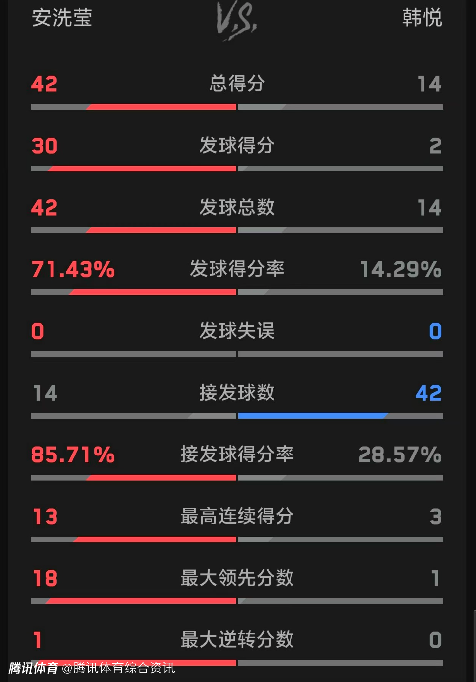双方技术统计如下(韩悦在后):总得分42-14、发球得分30-2、发球得分率71.43%-14.29%。