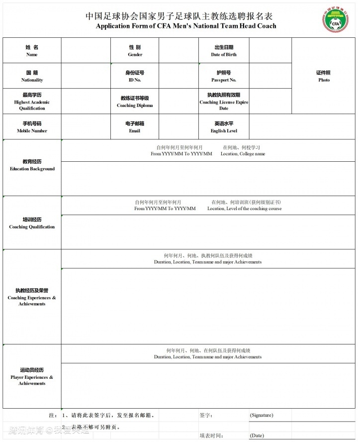 足协还提出了7项新帅的条件,60岁以下、国籍不限、全职,持有效职业教练证,有大赛或高水平联赛执教经历,沟通能力强、身体好、品行佳,无不良记录,熟悉现代足球技战术。有意者需按要求填写选聘报名表,参与竞聘。