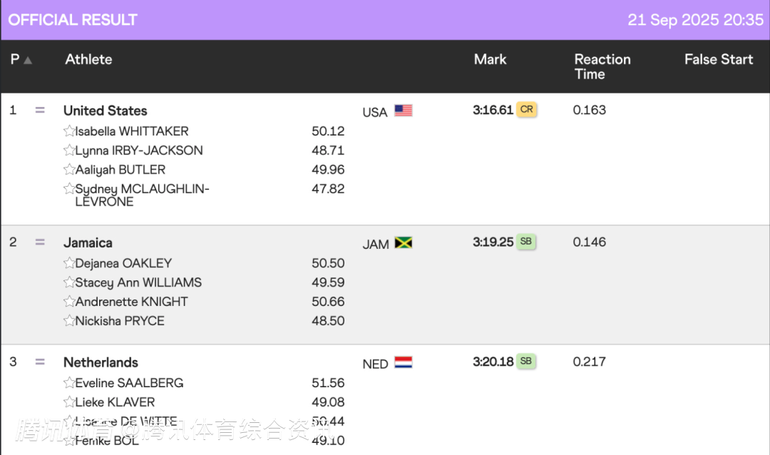 2025-09-21 20:10北京时间9月21日,2025年东京田径世锦赛女子4x400米接力决赛,美国队一路领先,镇守第四棒的麦克劳林再次跑出48秒以内的分段(47.82),最终3分16秒61打破赛会纪录,以超过2秒的优势轻松夺冠。