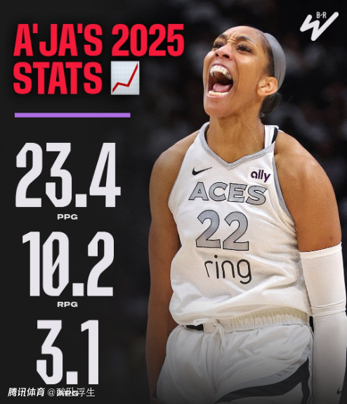 除此之外,阿贾-威尔逊本赛季常规赛阶段,她场均轰下23.4分10.2篮板3.1助攻1.6抢断2.3盖帽的全能两双数据,三项命中率分别是50.5/42.4/85.5%。