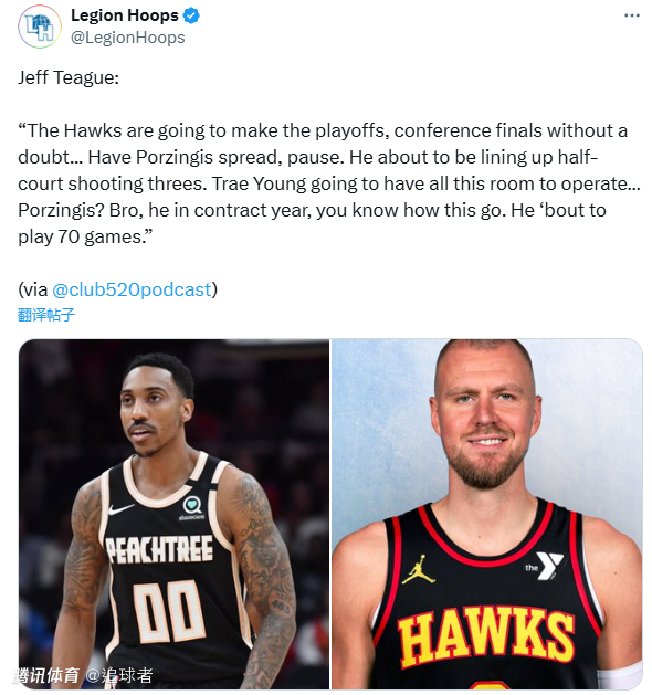 近日,前老鹰球星杰夫-蒂格表示:“老鹰队肯定会打进季后赛,甚至进入分区决赛。如果让波尔津吉斯拉开空间,等等。他很可能会在半场尝试投三分。特雷-杨将拥有充足的操作空间。波尔津吉斯?兄弟,他正处于合同年,他知道该咋办,他要打70场比赛。”