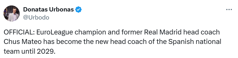 西班牙男篮官宣!马特奥将成为国家队新任主帅 曾执教山西男篮