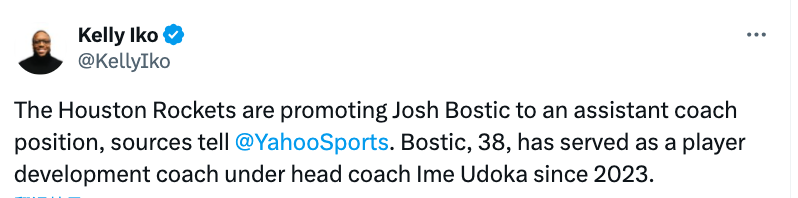 升职了!火箭提拔博斯蒂克为助教 过去2年一直担任球队球员发展教练