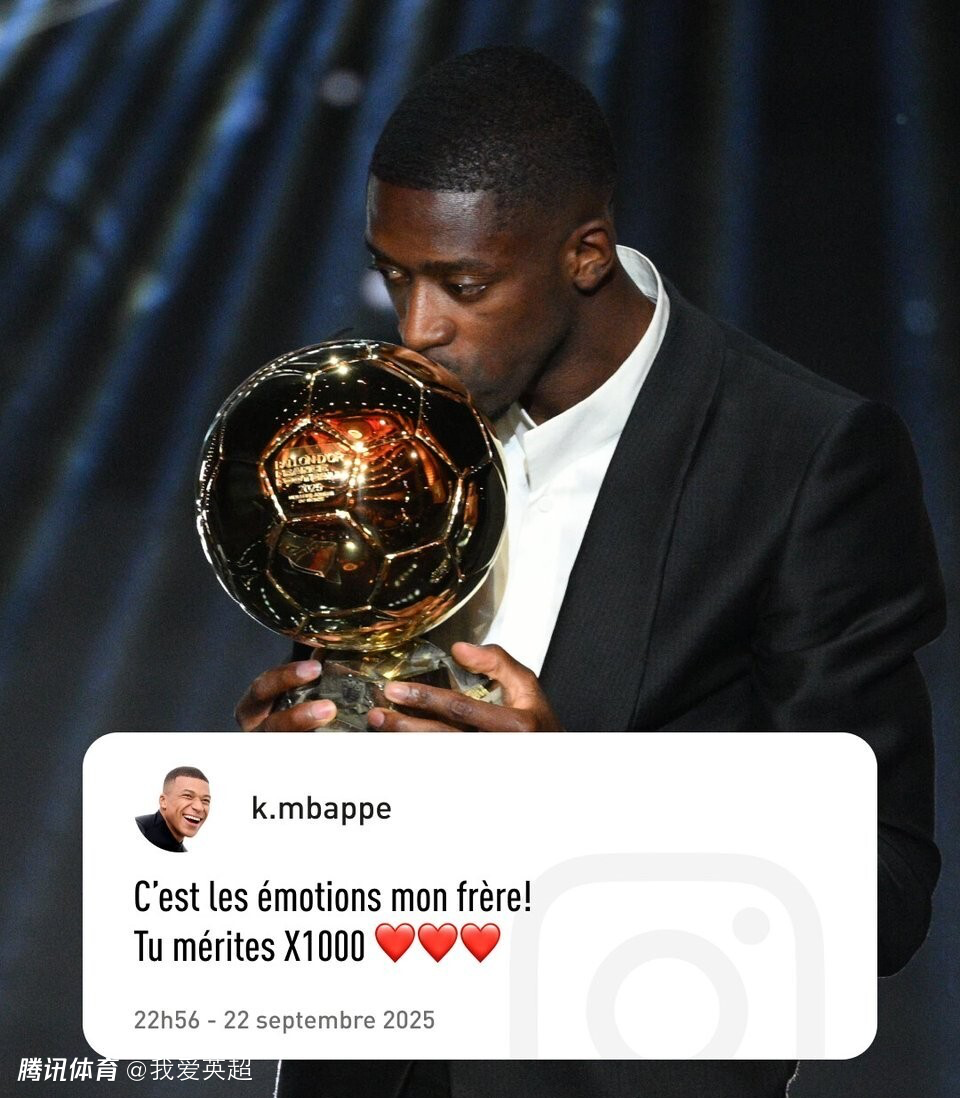 2025-09-23 06:00北京时间9月23日,28岁的大巴黎射手登贝莱,击败亚马尔,首次获得金球奖殊荣。而作为法国国家队的队友和大巴黎前队友,姆巴佩第一时间在社媒发文向登贝莱祝贺。
