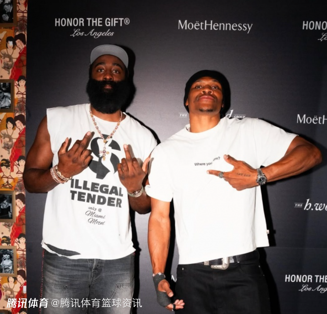 与威少的同框照中,两人都身穿便服,哈登穿着一件白色的坎肩,脖子上戴着一个金色的十字项链,而威少则是穿着一件白色短袖,而他的右手则是绑着护具,他在5月份曾做了一个右手手术,以治疗自己在上赛季出现的两处骨折症状。