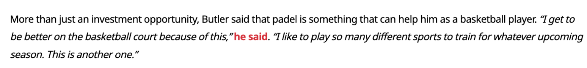 据悉,巴特勒在板式网球领域投入了大量资金,他表示板式网球对自己而言不仅是投资机会,更能帮助自己提升篮球水平:“打板式网球能让我在篮球场上表现更出色,为了备战即将到来的赛季,我喜欢通过参与各种不同的运动来训练,板式网球就是其中之一。”
