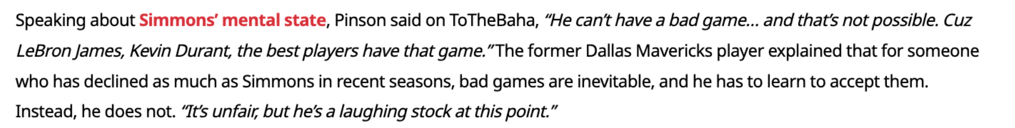 随后平森继续解释道,对于像西蒙斯这样近几个赛季状态下滑明显的球员来说,发挥不佳的比赛是不可避免的,他必须学会接受,但西蒙斯并没有做到,“这对他不公平,但在这一点上,他已经成了众人的笑柄。”平森说道。