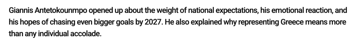 之后字母哥也把目光投向未来:“我们的目标远不止一枚铜牌,当然,前路必然充满挑战,其他球队都在飞速进步,像是塞尔维亚、法国,到2027年,还会遇到加拿大、美国、南苏丹、澳大利亚。这些国家的球队都极具竞争力,实力会非常强劲。我们自己必须不断提升:要坚持训练,让队里的年轻球员在各自赛季中好好成长,为两年后的比赛做好准备,回来助力国家队。”