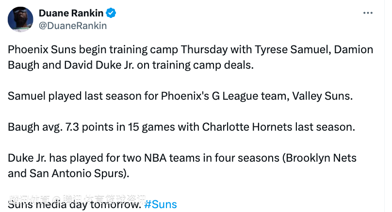 太阳将于9月26日开启训练营:塞缪尔、鲍和杜克三人将以训练营合同球员身份加入