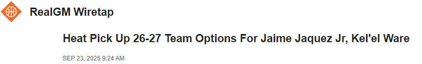 2025-09-23 21:50北京时间9月23日,根据NBA记者Keith Smith报道,热火队已经执行了哈克斯和韦尔新秀合同中的球队选项,其中哈克斯的选项为新秀合同的第四年选项,韦尔的选项为第三年选项。