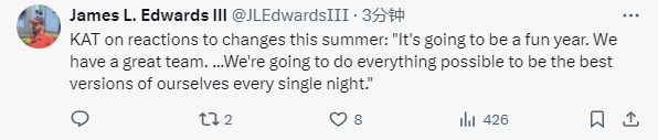 唐斯先是对7月份的一则报道予以否认,称自己在今年夏天并未对手指或膝盖进行过治疗(或手术)。在谈到新赛季时,唐斯说道:“新赛季会很有趣。我们拥有一支很棒的球队,我们会拼尽全力,在每一个夜晚都成为最好的自己。”