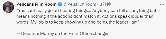 在谈到鹈鹕队的管理层变更时,穆雷表示:“不能光听别人怎么说,任何人都能跟我们承诺任何事,但如果没有实际行动支撑,那些话毫无意义。行动胜于言语。我的职责就是继续坚守岗位,做好我作为领袖该做的事。”