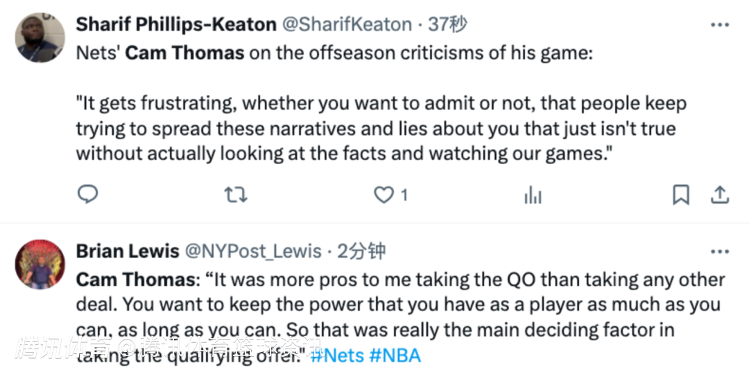 托马斯在谈及与篮网签下资质报价时表示:“这确实令人沮丧,但对我而言,接受资质报价比接受其他任何合同都更有利,我更希望能掌控自己的处境。作为一名球员,这种对自身处境的掌控权正是你所追求的。接下来我会打完这个赛季,之后再看情况如何发展。不过能回到这里,再次在球迷面前打球,我很开心,我来这是为了打球,这才是最重要的。”