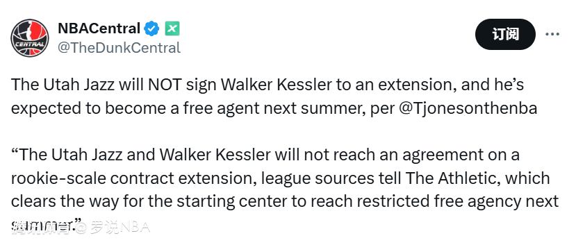2025-09-25 05:30北京时间9月25日,据联盟消息人士向The Athletic透露,犹他爵士队与中锋沃克-凯斯勒未能就新秀合同的续约事宜达成协议,这意味着他将在明年夏天成为受限制自由球员。