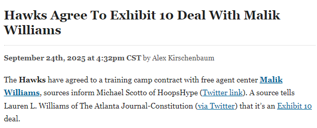2025-09-25 06:40北京时间9月25日,据记者Michael Scotto报道,有消息人士透露,老鹰队已与自由球员中锋马利克-威廉姆斯达成训练营合同协议。另有消息人士向队记Lauren L. Williams 表示,这份合同为Exhibit 10合同。