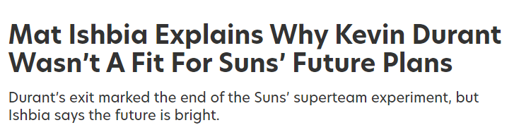 伊什比亚说道:“杜兰特是一位出色的球员,这一点毋庸置疑,但他就是不适合我们未来的发展方向。他拥有一段不可思议的职业生涯,可他与我们未来的规划不匹配。我们祝福他一切顺利,但我们同样喜爱目前球队中的这些球员。”