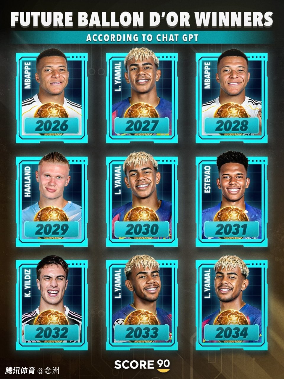 未来9年金球奖预测:姆巴佩明年获奖!亚马尔4次夺魁,2人出人意料