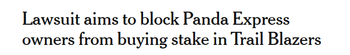 RAJ体育公司由 亚历克斯-巴塔尔和丽莎-巴塔尔-梅里奇兄妹经营,对熊猫快餐的创始人程正昌和蒋佩琪夫妇提起了诉讼。诉状尚未公开,但RAJ体育公司请求法官禁止程正昌和蒋佩琪夫妇“签订或推进任何” 涉及开拓者股权的协议。程氏家族是熊猫快餐的所有者,也是由卡罗莱纳飓风队老板汤姆-邓顿领导的投资集团成员。9月13日,邓顿及其投资者团队签署了一份购买协议,以42.5亿美元的价格从保罗-艾伦遗产管理机构手中收购开拓者。