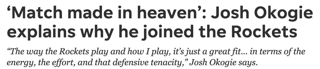 奥科吉与乌度卡均有尼日利亚血统,两人此前便已相识。奥科吉表示,作为自由球员,休斯顿庞大的尼日利亚社区也是吸引他加盟的原因之一。“他是我的尼日利亚兄弟,能为他效力,我感到非常兴奋。”奥科吉说道。