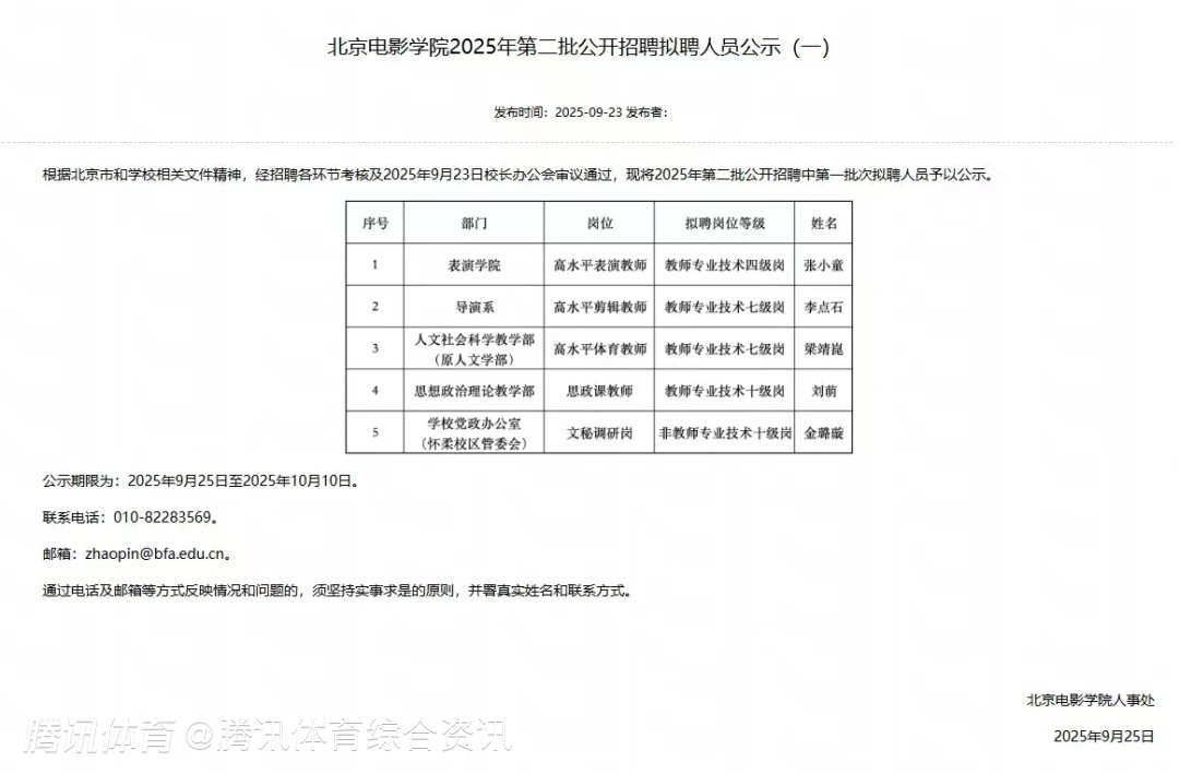 2025-09-25 10:50北京时间9月25日,北京电影学院2025年第二批公开招聘拟聘人员公示,梁靖崑获聘人文社会科学教学部“高水平体育教师”岗位,属于事业编制专业技术岗位(七级)。该公示由北电人事处于今日正式发布。