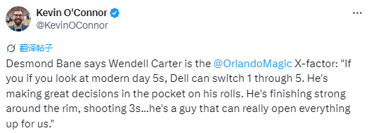 贝恩说道:“如果你观察当今的五号位球员,温德尔-卡特能从一号位防到五号位。他在挡拆顺下后的进攻选择非常出色,在篮下终结能力强劲,还能投三分。他正是那种能为我们彻底打开局面的球员。”