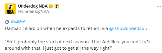 利拉德表示:“该死的,很可能要到下赛季初了。跟腱这伤,可不能瞎折腾。我得彻底康复才行。”