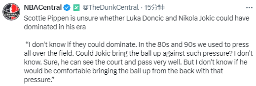 皮蓬说道:“我不知道他们能不能做到统治级表现。在 80、90 年代,我们打球时全场都会施压。约基奇在这样的压力下还能运球推进吗?我不确定。当然,他的球场视野很好,传球也极具水准。但我不清楚在那种压力下,他从后场运球推进时能否感到从容。”
