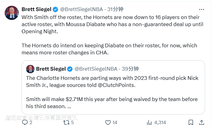 随后,记者Brett Siegel跟进报道,表示随着史密斯离队,黄蜂队目前的激活名单人数已降至16人。其中,迪亚巴特持有一份非保障合同,该合同的保障状态将持续至揭幕战打响前。