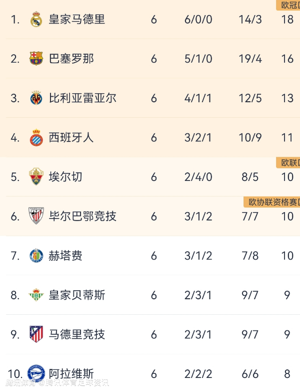西甲第六轮积分榜:皇马全胜第一 巴萨紧随其后 升班马埃尔切不败排名第五