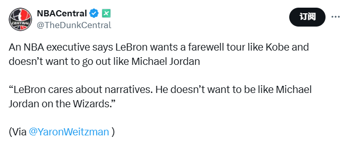 2025-09-26 09:30北京时间9月26日,据NBA记者Yaron Weitzman报道,一位NBA高管表示:“詹姆斯希望能像科比那样来一场告别巡演,而不想像迈克尔-乔丹在奇才队时那样结束职业生涯。”